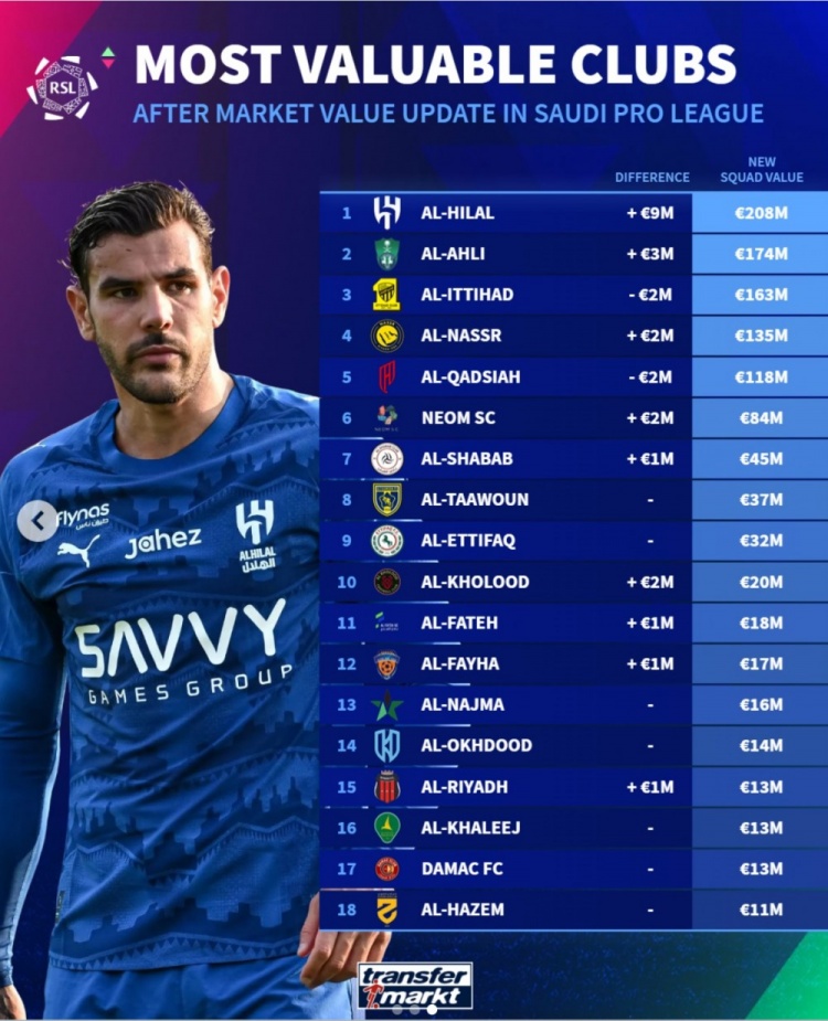 3月30日讯 德国转会市场公布了最新一期的沙特联身价情况,在俱乐部身价方面,利雅得新月以2.08亿欧居首,利雅得胜利以1.35亿欧位居第4。